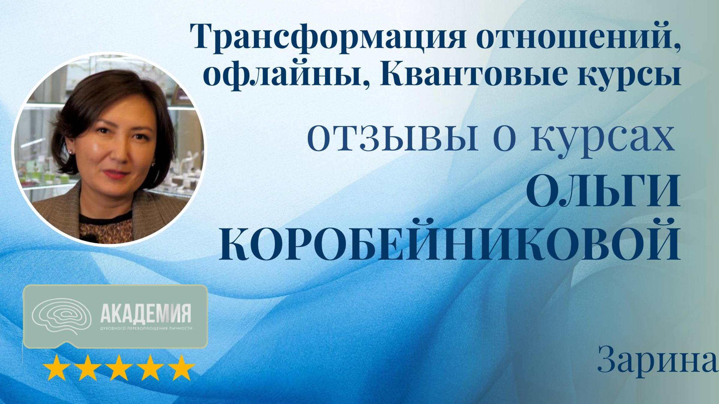 Отзывы о курсах Ольги Коробейниковой: "Трансформация отношений", офлайн-сессии, "Квантовые курсы" 60. Зарина - Курсы: Трансформация отношений, офлайн-сессии, Квантовые курсы Зарина подчеркивает, что курсы Ольги — это нелегкий, но результативный путь, который ведет к значимым переменам. - Точка А: Начало пути Зарина пришла на курсы, находясь в длительных токсичных отношениях и испытывая потребность в изменениях. - Путь к изменениям С помощью курсов Зарина смогла выйти из токсичных отношений и начать путь к новому, более гармоничному состоянию. - Точка Б: Результаты после курсов Ольги Коробейниковой Зарина кардинально изменила свою жизнь, обрела силу и внутреннюю мощь, а также построила новые, здоровые отношения. Отзывы Зарины показывают, что курсы Ольги Коробейниковой помогают участникам преодолеть трудные этапы в жизни, обрести уверенность и создать гармоничные отношения, освобождая от прошлого и открывая новые возможности.