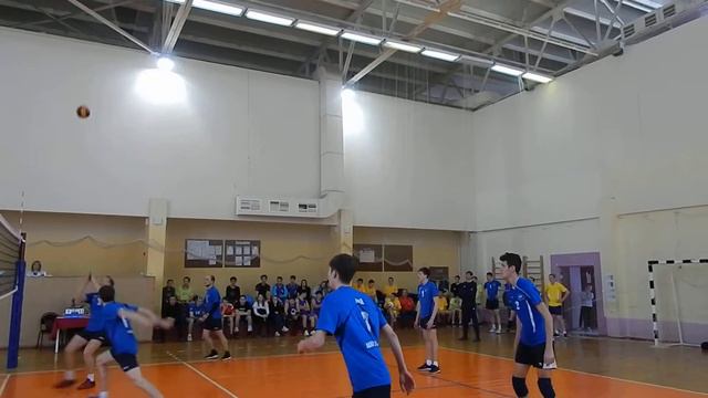Нестандартный игровой момент. Связка защищается с простого перелетающего мяча, делает высокую доводку к сетке, диагональный(в позиции на задней линии) выходит к сетке и делает передачу доигровщику в 4 -ю зону. доигровщик забивает!