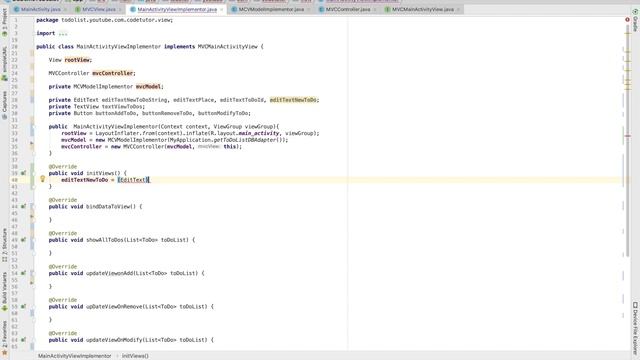 In this video we have a look at how to get started with implementation of View in MVC design pattern for Android. It gets started by creating a very generic interface called MVCView which gets extended by another interface called MainActivityMVCView. This interface has got more specific methods needed by the functionality and feature. Finally it comes down to implementing this interface. Follow me on Twitter: https://twitter.com/anilvdeshpande Github link to source code: https://github.com/AnilDeshpande/DBDemoToDoList/tree/mvc-implementation