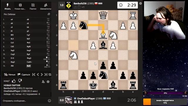 Друзья, всем привет. Партия со стрима, представляю вашему вниманию. Шахматы. Блиц 3+0 на chess.com. Если интересно, - подписывайтесь на канал, ставьте лайки, оставляйте комментарии. Поддержка через: DonationAlerts: https://www.donationalerts.com/r/onedebutplayer Бусти: https://boosty.to/onedebutplayer/donate Donatepay: https://new.donatepay.ru/@1272445 Или на карту в телеграм-канале: https://t.me/onedebutplayer/3