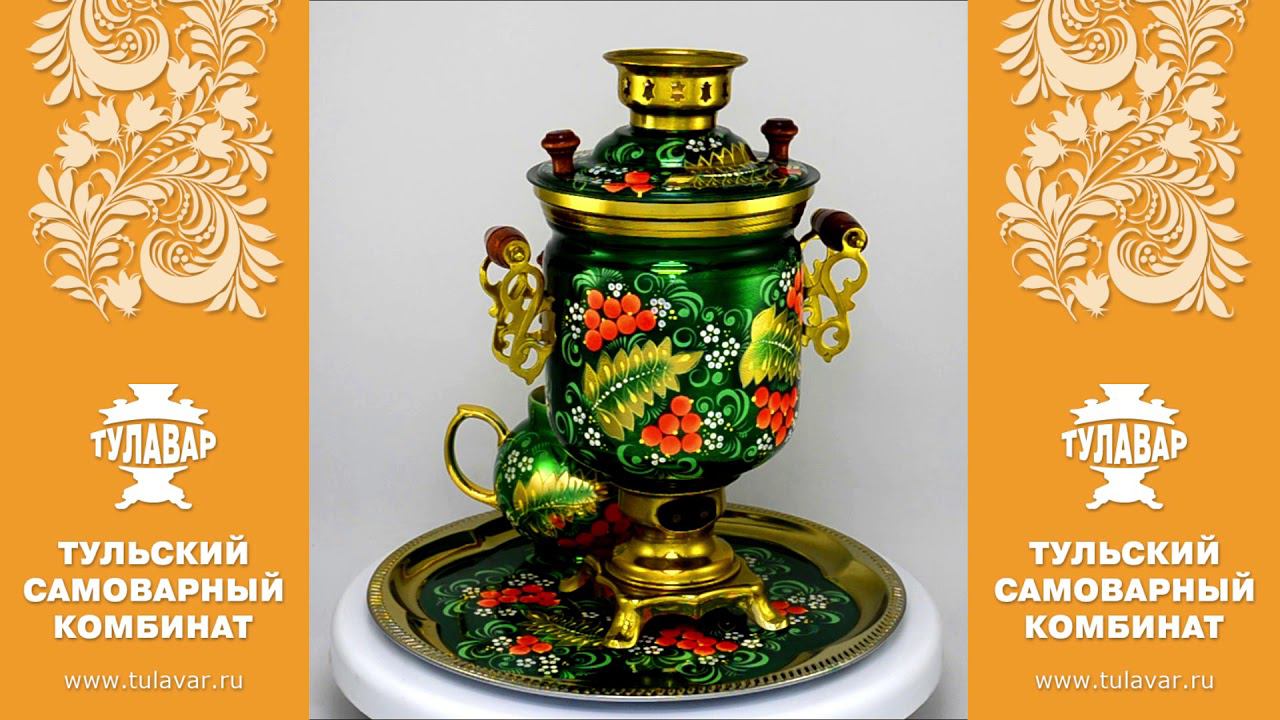 Ссылка на самовар в каталоге магазина ТУЛАВАР https://tulavar.ru/catalog/raspisnye/narodnoe-tvorchestvo/1711.html Обзор электрического расписного самовара «Рябина на зеленом». Объем 3 литра, форма банка, в наборе поднос и чайник. Производство ТСК ТУЛАВАР г. Тула. Традиционный самовар от производителя – гарантия качества и безупречной работы. Самовар сделан из латуни, ручки деревянные. Художники ТУЛАВАР используют только термостойкий лак и краски, что делает покрытие долговечным. Нагревательный элемент самовара - ТЭН мощностью 1 кВт, работает от сети 220В. Материал - Латунь Производитель - г. Тула, ТСК ТУЛАВАР Гарантия - 5 лет Форма самовара - Банка Объем - 3 литра Время закипания - 15 - 20 минут Размер - 36 х 28 см Вес - 2,5 кг ГОСТы завода - 7400-81 Заказать самовар по телефону: +7 (950) 922-13-51 +7 (4872) 583-843 contacts@tulavar.ru https://tulavar.ru