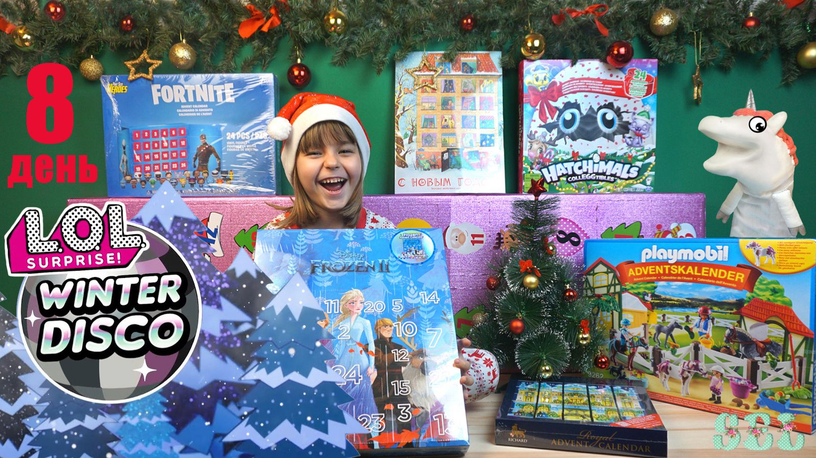 День восьмой. Вместе с нашим волшебным единорогом Жорой и Софи-Элис распаковка и обзор оригинальных новогодних адвент календарей и одного огромного самодельного! Что круче?! Адвент календарь Funko Fortnite, Hatchimals, Frozen 2, Kinder Maxi Mix, Playmobil или самодельный, который я сделала своими руками в подарок? Косметика, сладости, игрушки, сюрпризы или конструктор? Давайте посмотрим!