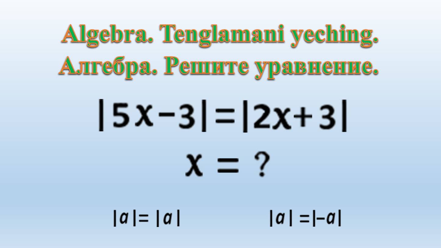 Алгебра. Решите уравнение |5x-3| = |2x+3| Математика. Алгебра. Геометрия. Для учителя, ученика https://t.me/RUTUBEMATEMATIK