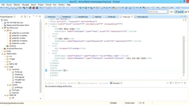 Tái sử dụng các trang JSP trong một ứng dụng web - Tạo ra các trang JSP tái sử dụng chung cho nhiều trang JSP gồm header.jsp, footer.jsp, message.jsp, right.jsp, navigator.jsp,... - Cập nhật lại các trang login.jsp, home.jsp và profile.jsp