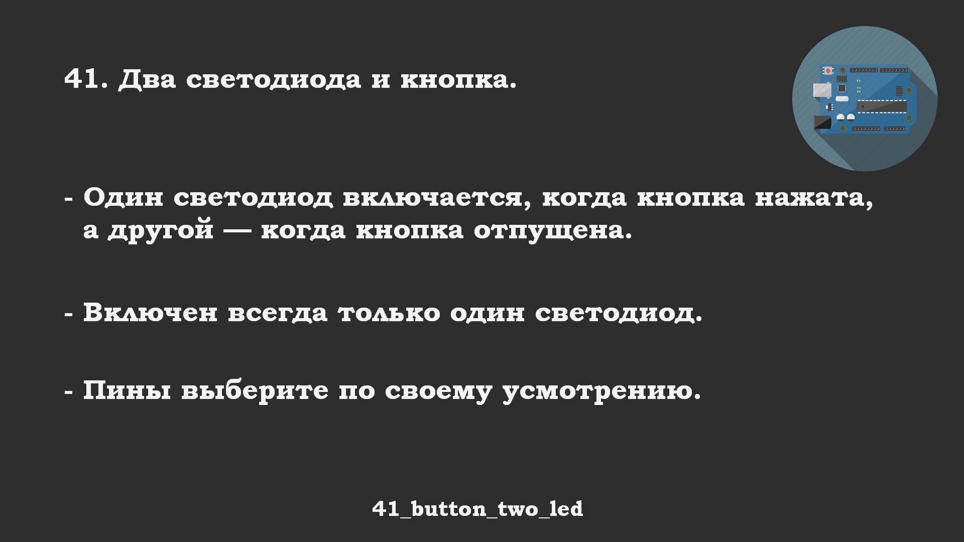 #41 ответ: Один светодиод включается, когда кнопка нажата, а другой — когда кнопка отпущена.