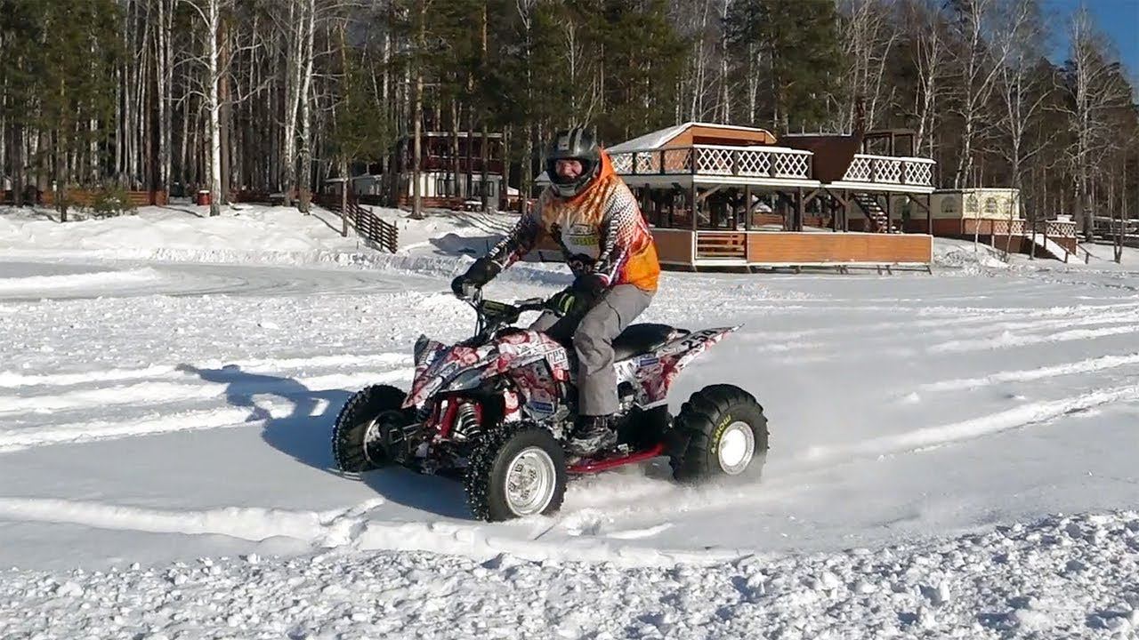 Yamaha Raptor (YFZ 450) гоняет по снегу на снежной резине