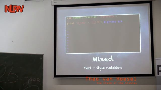 NLPW::2014 Nederlandse Perl Workshop, 25-April, Utrecht by: Theo van Hoesel READING | WRITING | COMPUTING FRACTIONS IN PERL CODE In common language we use fractions more often then we are aware of. However, since the introduction of computational power and poor designed keyboards or character sets, we accepted insane notations. Floating-point numbers belong to the domain of science and can be used to express approximations of results. As math-teacher and forum-moderator, I was quite frustrated about the abusive use of all kind of symbols, like the 'slash' in expressions: X^2=(3 1/2X+10)/3 # Arggh! Simply because one did not know how to type a mathematical correct expression in Unicode: ?² = 3½?+10 ÷ 3 # Yay! We have Unicode So, we have Unicode, but what about using Unicode fraction in your Perl code: reading, writing and computations, all in one! But do not think that Unicode is your friend for doing fractions and math on one single line: with all the different symbols there is still a essential 'missing slash'