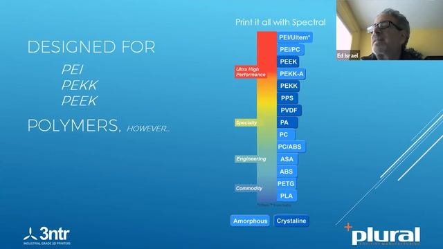 ABOUT April 21-22, 2020: The Dyndrite Developer Council was a global 2-day additive manufacturing virtual event which gathered leaders in the AM industry to reveal new initiatives, products, and real-world accomplishments defining the digital age of manufacturing. LEARN MORE https://bit.ly/2KWkwQd DDC2020 VENDOR High Temperature Polymer Printing Ed Israel, President and Co-Founder, Plural Introducing the new, unique Spectral 30, the next generation in high temp printing for PEEK, PEKK, and Ultem. Printer development was born out of the European Clean Sky project and partners included Airbus and RESCOLL (a polymer research firm). https://www.pluralam.com/