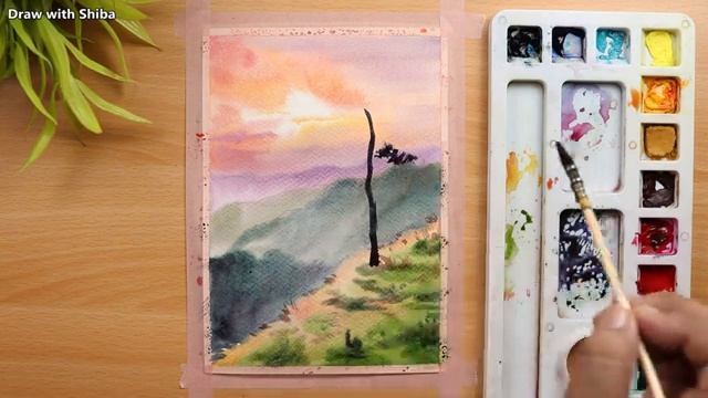Дерево на фоне горного пейзажа акварелью. Простой пошаговый урок для начинающих