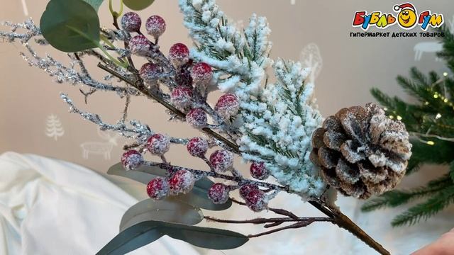 332424 Украшение декоративное Ветка хвойная заснеженная с шишками и красными ягодами 50см
