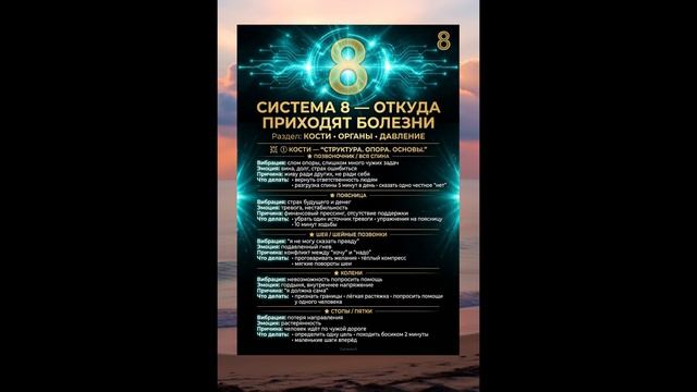 В Системе восемь болезнь — это не ошибка. Это квантовый сбой поля, который возникает в тот момент, когда человек перестаёт совпадать с собой. Мы привыкли думать, что боль возникает из-за тела. Но тело — всего лишь последняя инстанция, последний уровень, который принимает удар после того, как долгое время молчали: психика, эмоции, энергия и судьба. Квантовая физика говорит: всё состоит из волн, информации и вибрации. Ваше тело — не исключение. Каждая кость, каждый орган — это узел энергетического поля, который реагирует на давление мыслей и эмоций. Когда Вы подавляете правду — поле сжимается. Когда живёте ради чужих ожиданий — траектория ломается. Когда выбираете страх вместо движения — поток застывает. И именно в этом месте возникает боль. Болезнь — это точка, где Вы потеряли согласие со своей судьбой. ⭐ ПОЗВОНОЧНИК — КВАНТОВАЯ ОСЬ ЖИЗНИ В науке позвоночник — это опора тела. В Системе восемь — это опора судьбы, вертикальная линия, по которой движется Ваш жизненный импульс. Когда Вы несёте слишком много чужих задач — поток ломается. Слишком много долгов, обязательств, чужих ожиданий → поле сжимается → волна опоры теряет высоту → позвоночник забирает удар. С точки зрения квантовой динамики это называется: «критическая перегрузка по оси ответственности». И тело говорит: «Я больше не выдерживаю жизнь, которую ты несёшь». ⭐ ПОЯСНИЦА — ВИБРАЦИЯ СТРАХА ДЕНЕГ В пояснице находится центр, отвечающий за безопасность. Когда человек живёт в тревоге, поле вокруг поясницы начинает колебаться на частоте страха. В физике это называется дестабилизация поля низкочастотными осцилляциями. Каждый долг, каждое «а вдруг не хватит», каждый удар по уверености создаёт микроволновые провалы. Со временем эти провалы становятся хроническими — и поясница начинает болеть. Поясница — это индикатор того, насколько человек верит, что мир удержит его. ⭐ ШЕЯ — РАЗРЫВ МЕЖДУ «Я ХОЧУ» И «Я ДОЛЖНА» Шейные позвонки — одно из самых чувствительных мест поля. Это точка, где проходят самые тонкие квантовые каналы — каналы намерения. Когда человек боится сказать правду, подавляет желания, живёт по «надо», но молчит о «хочу» — каналы сжимаются. В квантовой физике это называется эффект разрушенной сверхпозиции. Человек пытается одновременно быть собой и быть удобной → амплитуда гасится → возникает блок. И шея говорит: «Ты задушила свои желания». ⭐ КОЛЕНИ — КВАНТОВЫЙ УЗЕЛ ГОРДОСТИ Колени — это про гибкость. Когда человек не может попросить о помощи, когда живёт в переполненной гордости, внутреннем напряжении, убеждении «я должна сама», траектория движения ломается. Квантовая модель описывает это как разрыв векторной продолженности пути. Вы хотите двигаться, но Ваше поле стоит. Траектория не совпадает → возникает боль. Колени заболевают тогда, когда человек слишком долго тянет жизнь в одиночку. ⭐ СТОПЫ — НАРУШЕНИЕ ТРАЕКТОРИИ СУДЬБЫ Стопы — это GPS души. Это датчики направления. Когда человек идёт по чужому пути — работа, отношения, стиль жизни, мечты не свои — поле ног теряет резонанс. С точки зрения квантовой физики происходит расхождение частоты пути и частоты души. Поле больше не ведёт вперёд. И тогда начинают болеть стопы и пятки. Это самый честный знак Вселенной: Вы идёте не туда. ⭐ ГЛАВНЫЙ ЗАКОН СИСТЕМЫ ВОСЕМЬ Болезнь — это всегда сигнал о том, что поле вышло 