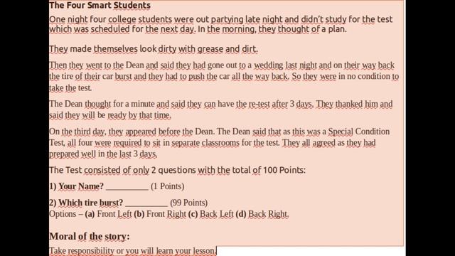 Moral of the story: Take responsibility or you will learn your lesson. --------------------------------------------------------------------------- Check out more Stories on this playlist https://youtube.com/playlist?list=PLjhKzQeBc6HZF21EN-txlxF5r72_WEspv --------------------------------------------------------------------------- Please subscribe to my channel https://www.youtube.com/channel/UCYfj35Wq7_BhrxHnhUbG_8w?sub_confirmation=1 --------------------------------------------------------------------------- #short_story #student #quick_meta_knowledge #moral_stories Short story: The Four Smart Students | Blink Summary #ShortStories #Blinksummary