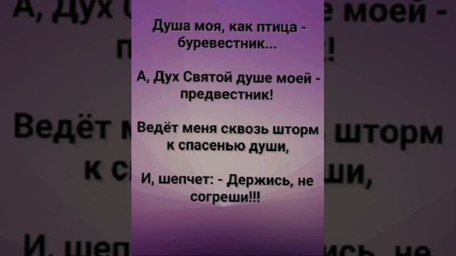 ХРИСТИАНСКИЕ ПЕСНИ ДЛЯ ХВАЛЫ ПОКЛОНЕНИЯ ПРОСЛАВЛЕНИЯ ЕВАНГЕЛИЗАЦИИ ДУХОВНОГО РОСТА ПРОБУЖДЕНИЯ ВОЗРОЖДЕНИЯ #господь#музыка#христианская_музыка#музика#христианскиепесни#бог#христианскиестихи#любовь#христианство#стихи#песня#песни#иисус#иисусхристос#иисусмойбог#иисус_христос#иисусбог#иисусгосподь#хвалы_и_поклонения#хваление#хвала#прославление#духсвятой#духовныйрост#духовноепробуждение#духовность#евангелие#евангелизация#евангельскаявесть#духовный_рост#пробуждение#рождество#рождествохристово#божий#божийнарод#божьеслово  #ХристианскаяПесня #ХристианскоеПоклонение #ХристианскаяНоваяПесня #ПастырьМоейДушы #ХристианскаяМузыка #ПесняСлавы #Иисус #ЛюбовьБожья #ХристианскиеТексты #СлаваГосподу #ВераИПоклонение #ВечнаяЛюбовь #RussianChristianSong #RussianChristianWorship #RussianChristianMusic #RussianWorship #NewRussianChristianMusic  #RussianChristianMusic #RussianSongOfPraise #Jesus #GodsLove #ChristianLyrics #GloryToGod #RussianFaithAndWorship #EternalLove #Пасха #Воскресение #ХристосВоскрес #пробуждение #возрождение https://stihi.ru/avtor/zhanna70 "КРЫЛЬЯ ЗА СПИНОЙ!" СЛОВА, МУЗЫКА, ОБРАБОТКА:  ЖАННА ВОЛКОВА-ВАРЛАМОВА https://stihi.ru/2025/08/15/1029 Стихи Жанна Юрьевна Волкова-Варламова Вступление: О, мой Господь, Ты - жизнь моя...  Ты - Свет, Ты - Дверь, моя Заря! Ты - Крепость, Пастырь добрый мой...  Всегда, и, повсюду Ты со мной!!!  1 Куплет Прошу, дай силы мне и крылья за спиной...  Чтоб ввысь лететь мне следом за Тобой...  Сквозь бури все, где страх и тьма, и, воет ветер... И, сквозь туман, где взгляд совсем не светел!  Исполнить помоги души мечту...  Удалить от неё всю нечистоту!  Припев: Душа моя, как птица - буревестник...  А, Дух Святой душе моей - предвестник!  Ведёт меня сквозь шторм к спасенью души, И, шепчет: - Держись, не согреши!!!  2 Куплет Твой голос тих, но он звучит во мне...  В Словах Святых, начертанных в Твоём письме.  В молитве, что рождается внутри...  Напоминая о пролитой Твоей Крови!  И, каждый миг я чувствую Твоё тепло...  Святое присутствие, что дарит мне добро!  Припев: Душа моя, как птица - буревестник...  А, Дух Святой душе моей - предвестник!  Ведёт меня сквозь шторм к спасенью души, И, шепчет: - Держись, не согреши!!!  [Violin melodic interlude] Бридж И, если вдруг я с курса собьюсь...  К Тебе в молитве снова обращусь!  Ты путь укажешь мне опять...  Поможешь верить и летать, любить, и, прощать!  Припев: Душа моя, как птица - буревестник...  А, Дух Святой душе моей - предвестник!  Ведёт меня сквозь шторм к спасенью души, И, шепчет: - Держись, не согреши!!!  3 Куплет В потоке дней и суеты мирской.. .  Я нахожу в Тебе Святой покой!  Твоя Кровь, что пролита была за грех...  Защитный щит от проклятий всех!!!  От зла, от боли, от падения земного...  Ищу в Тебе для души я покрова!!!  Ты бережешь меня, мой Бог, Вседержитель! Души моей Ты - Вечный Покровитель!!!  Припев: Душа моя, как птица - буревестник, А, Дух Святой душе моей - предвестник!  Ведёт меня сквозь шторм к спасенью души, И, шепчет: - Держись, не согреши!!!  Заключение: Ты - Свет, Ты - Дверь, моя Заря! Вслед за Тобой лечу теперь и я!!!  К обители Твоей, где нет печали...  Где вечный свет, и, радость без слёз... которую мы ждали!!!  Аллилуйя! Аллилуйя! Аллилуйя!!! 14.08.2025 Жанна Волкова-Варламова
