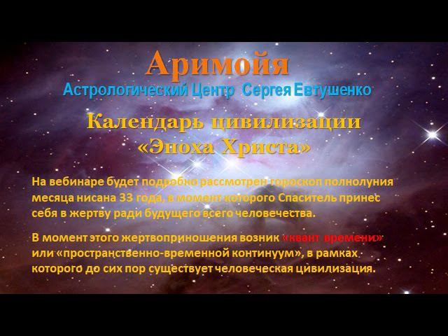 Тема вебинара непосредственным образом связана с праздником Светлого Христова Воскресения. Акт самопожертвования Бога-Сына будет рассмотрен в качестве начала целой "Эпохи Христа", в которой живет современное человечество. 1) Подробное рассмотрение астрологической карты полнолуния месяца нисана 33 года н.э., когда Спаситель принес себя в жертву ради будущего всего человечества. В момент этого жертвоприношения возник "квант времени" или "пространственно-временной континуум", в рамках которого до сих пор существует человеческая цивилизация. 2) Анализ основных разворотов карты "эпохи Христа", и соответствующих им событий мировой истории.