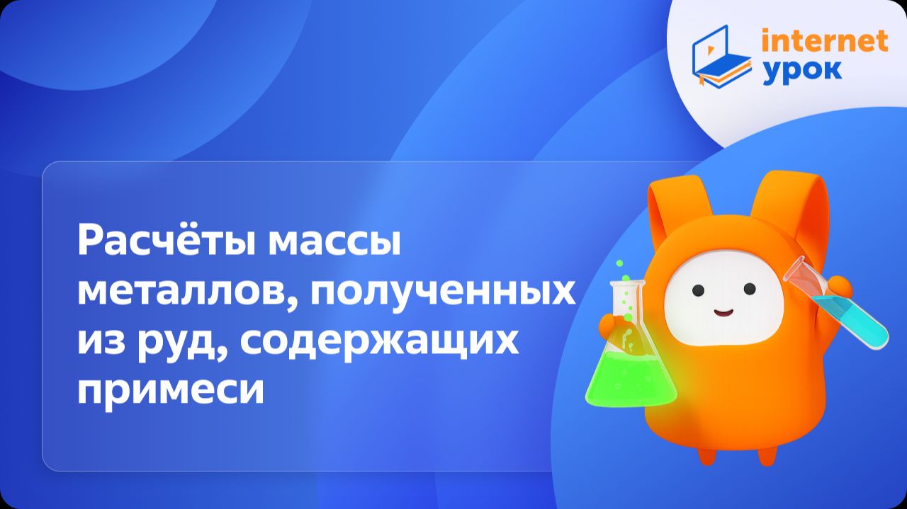 Хотите больше дополнительных материалов по этой теме? Они тут: https://interneturok.ru/h/biblioteka/khimiia/9-klass/raschioti-massi-metallov-poluchennih-iz-rud-soderzhashih-primesi/1. Интересны видео и по другим школьным темам? Будем рады видеть вас здесь: https://interneturok.ru/kursy_i_uslugi/biblioteka_videourokov/. ИнтернетУрок — онлайн-школа с богатой библиотекой материалов по всем школьным предметам: видеоуроки, конспекты, тесты и тренажёры, оперативные ответы на ваши вопросы. И никакой рекламы! В уроке рассмотрен алгоритм решения ещё одного типа расчётных химических задач. Вы уже знаете, что сырьём для получения металлов служит руда. В руде, кроме полезного компонента, из которого, как правило, путём восстановления получают металл, присутствует и пустая порода – примесь. Учитель расскажет, как рассчитать массу металла, полученного из руды, содержащей примеси. Содержание: 0:00 - Введение 0:48 - Массовая доля полезного компонента. Задача 1 02:22 - Задача 2 04:07 - Задача 3 07:33 - Заключение Дополнительный материал: 07:59 - Перевод единиц измерения 09:23 - Ещё один пример решения задачи 11:34 - Вольфрам и оксид вольфрама (VI) Другие видеоуроки по химии 9 класс смотрите в плейлисте: https://rutube.ru/plst/1281771