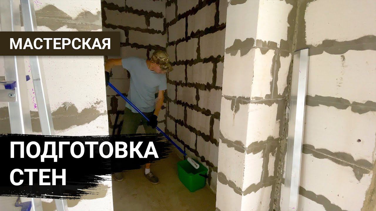 Сделали новый скрытый водосток с крыши. Зачищаю и грунтую стены под штукатурку