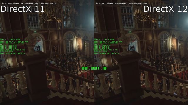 Конфигурация ПК: - Процессор: Phenom II X4 970 3.5 ГГц - Видеокарта: Nvidia GTX 960 OC 1484 МГц, 4 Гб VRAM (GV-N960OC-4GD) - ОЗУ: 12 Гб 1866 МГц DDR3 Запись идет через ShadowPlay, так что без записи на 2-4 FPS больше. Как и ожидалось, DirectX 12 показался не столь эффективным. В некоторых моментах он опережал DirectX 11, но в связи с сильными просадками и зависаниями (их нет в тесте, т.к. они мешали синхронизации) это преимущество теряется. В итоге средний FPS чуть выше на DX 12. Так же забавное наблюдение - больший объем потребления видеопамяти и ОЗУ в режиме DX 12. Не ясно, с чем это связано, но дополнительной производительности это не дало.