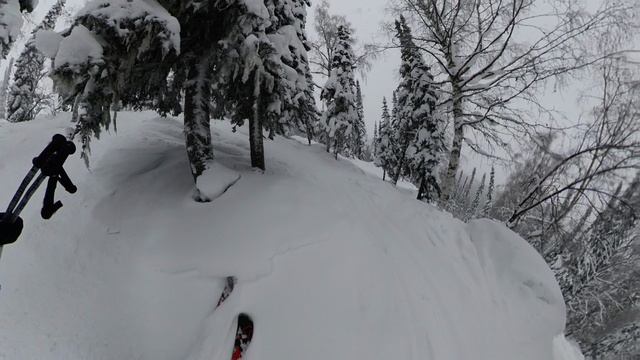 Соло фрирайд в Шерегеше в лесу между синим подъёмником и долларом.