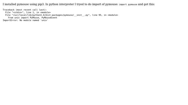 Ubuntu: How to solve problem in Python 3: No module named 'unix'? Helpful? Please support me on Patreon: https://www.patreon.com/roelvandepaar With thanks & praise to God, and with thanks to the many people who have made this project possible! | Content (except music & images) licensed under cc by-sa 3.0 | Music: https://www.bensound.com/royalty-free-music | Images: https://stocksnap.io/license & others | With thanks to user R S (https://askubuntu.com/users/393875), user mxdsp (https://askubuntu.com/users/458410), and the Stack Exchange Network (http://askubuntu.com/questions/683190). Trademarks are property of their respective owners. Disclaimer: All information is provided "AS IS" without warranty of any kind. You are responsible for your own actions. Please contact me if anything is amiss at Roel D.OT VandePaar A.T gmail.com.