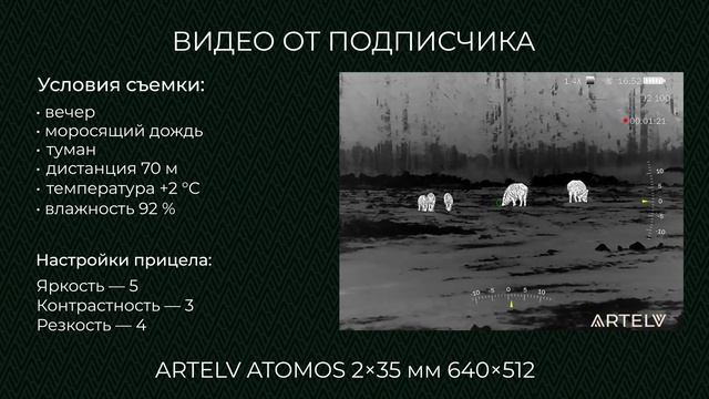 Съёмка велась в охотхозяйстве в Смоленской области вечером, в ходе планового учёта зверя, с дистанции 70 метров с помощью тепловизионного прицела ARTELV ATOMOS 2×35 мм 640×512, и в кадр попали кабаны. Во время учёта стояла слякотная погода. Моросящий дождь и туман сливались в густую дымку, а промокшая трава и лужи усложняли передвижение. 🔺 Условия съемки: Дистанция 70 м, температура +2 °C, влажность 92%. 🔺 Настройки прицела: Яркость — 5 | Контрастность — 3 | Резкость — 4 ➡ Узнать больше и оформить заказ: vk.cc/cRX7lN #охота #тепловизоры #ATOMOS
