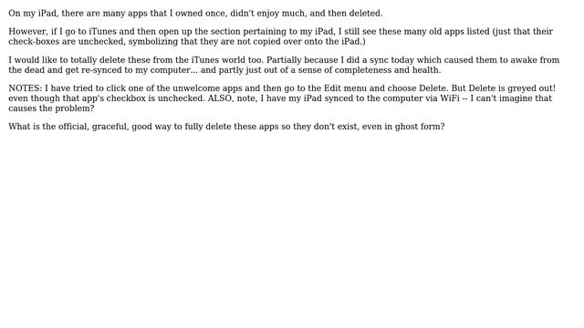 Apple: How delete an ipad app totally (rather than it continuing to exist when viewed over in iTunes)? Helpful? Please support me on Patreon: https://www.patreon.com/roelvandepaar With thanks & praise to God, and with thanks to the many people who have made this project possible! | Content (except music & images) licensed under CC BY-SA https://meta.stackexchange.com/help/licensing | Music: https://www.bensound.com/licensing | Images: https://stocksnap.io/license & others | With thanks to user nohillside (apple.stackexchange.com/users/9058), user mmmmmm (apple.stackexchange.com/users/237), user estephan500 (apple.stackexchange.com/users/7141), user daviesgeek (apple.stackexchange.com/users/7833), and the Stack Exchange Network (apple.stackexchange.com/questions/57068). Trademarks are property of their respective owners. Disclaimer: All information is provided "AS IS" without warranty of any kind. You are responsible for your own actions. Please contact me if anything is amiss at Roel D.OT VandePaar A.T gmail.com