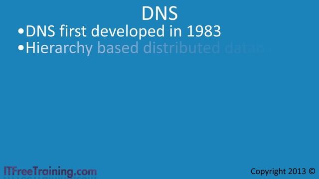 This course goes through DNS or Domain Name System. This video provides an introduction to DNS, however the videos in this course are dynamic in nature. As DNS changes, videos are added or removed as required to make sure that you always have the most up to date information. For all the DNS videos see the following link. http://itfreetraining.com/dns Download the PDF handout http://ITFreeTraining.com/handouts/dns/what-is-dns.pdf What Is DNS DNS is a system that primarily maps a name to an IP Address. Although it can be used to do the reverse, it is primarily given a name and asked what the IP Address is for that name. This is the same principle that is used for a phone book. Given a name, a person is able to look up the phone number for that person using the phone book. Hosts File Before DNS, a hosts file was created on the local computer that contained a list of computer names and their IP Addresses. The problem with this approach is that all computers needed to have a copy of the same hosts file. With a few computers this was not too difficult, however as networks got bigger so did the hosts file, making it harder to keep up to date due to the size of the hosts file and the number of computers that the hosts file had to be copied to. Nowadays, DNS is the preferred way to look up computers on the internet, however the hosts file is still present on modern computers. Whenever possible you should use DNS rather than the hosts file however in some rare situations it may be necessary to use the hosts file. DNS (Domain Name System) DNS was first developed in 1983 to address the shortfalls of the hosts file. It is a distributed database based on a hierarchy design. This hierarchy design means that it is possible to have two computers on the internet with the same name. For example ws1.example.com and ws1.ITFreeTraining.com. The computers have the same hostname as ws1, however after this it is different. The full DNS address like ws1.example.com is referred to as the fully qualified domain name. Since the fully qualified domain name is different, it allows two computers to exist on the same network that have the same host name. DNS Namespace DNS Namespace can be divided up in to different parts. Each part can be stored on different DNS servers, which makes DNS a distributed system. This allows control of DNS to be divided up and distributed across the world. A DNS server does not need to hold all the data for a fully qualified domain. For example a DNS server may only hold data for the .com, .edu, .au etc part of the domain space. Other DNS servers may hold additional parts of the fully qualified Domain Name, for example Microsoft, ITFreeTraining, and Amazon. By these DNS servers working together, a fully qualified domain name can be resolved. This will be covered in more detail in later videos as well as other features of DNS. For the rest of the DNS videos please visit http://ITFreeTraining.com/dns See http://YouTube.com/ITFreeTraining or http://itfreetraining.com for our always free training videos. This is only one video from the many free courses available on YouTube. References None