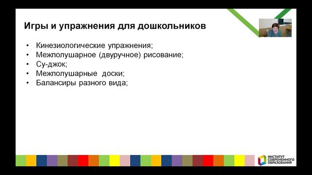 Вебинар будет интересен воспитателям и педагогам- психологам. Его задача, актуализировать знания педагогов в вопросах нейропсихологического подхода и методов внедрения нейропсихологических технологий в образовательный процесс с детьми дошкольного возраста. На вебинаре мы расскажем о том, какие упражнения можно и нужно использовать ежедневно в детском саду. Институт современного образования (ИСО) Об институте: Автономная некоммерческая организация дополнительного профессионального образования «Институт современного образования» Учредителем АНО ДПО «Институт современного образования» является АОНО ВО «Институт менеджмента, маркетинга и финансов» - это вуз, который более 30 лет занимается подготовкой востребованных кадров. 5 направлений деятельности АНО ДПО «Институт современного образования»: • Повышение квалификации, профессиональная переподготовка и профессиональное обучение для работников сферы образования. • Повышение квалификации и профессиональная переподготовка в сфере менеджмента, управления персоналом, бухгалтерского учёта, контрактных закупок, охраны труда, обеспечения безопасности, сервиса и оказания услуг населению и ещё более 30 направлений. • Курсы английского языка и программирования для взрослых и детей. • Корпоративные курсы и тренинги по направлениям подготовки. • Индивидуальные учебные программы под потребности организаций или обучающегося. Ключевые преимущества для наших слушателей: • Гарантия качества знаний • Удобно • Финансово выгодно Если вы хотите сменить профессию или расти и развиваться в своей — переходите на наш сайт https://isoedu.ru/, выбирайте образовательную программу и записывайтесь на обучение. Наша задача – чтобы каждый желающий получил качественное образование по приемлемым ценам. Контакты: Сайт: www.isoedu.ru ВК: https://vk.com/isoedu E-mail: dpo@doiso.ru, info@isoedu.ru По вопросам обучения (сроки обучения, проверка работ, выдача документов) обращайтесь по телефонам: +7 (910) 240-21-37, (910) 732-86-78.