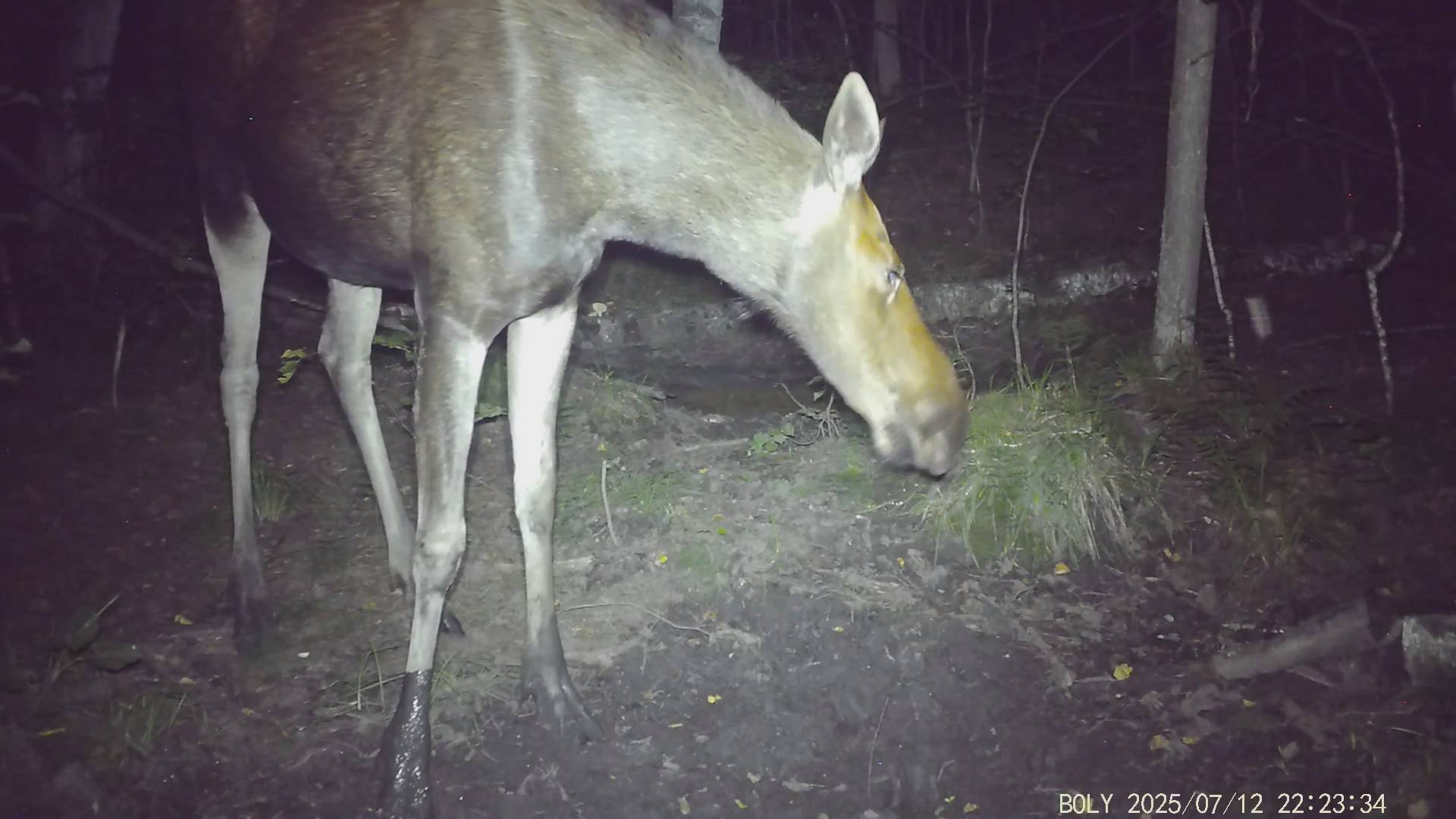 Фотоловушка красиво сняла лосиху ночью в лесу на водопое.