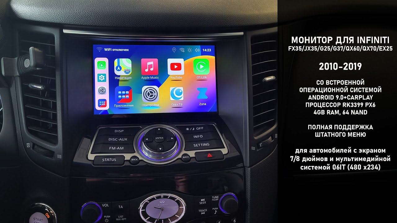 Описание и цены : https://unicar-m.com/product/zamena-shtatnogo-displeja-06it-na-monitor-hd-8-c-os-android-910-/ Монитор подходит для всех автомобилей марки Infiniti с мультимедийными системами 06IT, начиная от 2010 по 2019 годы выпуска. Штатная информация полностью передается на новый монитор, плюс Вы получаете полноценный андроид 9/10 с 4ГБ оперативной памяти и 64GB внутренним накопителем на процессоре RK3399 PX6 (6 ядер) Отличный вариант расширения мультимедийных возможностей Вашего автомобиля!!! Особенно для машин с системой 06IT (480 на 234) , так как с таким низким разрешением сейчас все остальные варианты, кроме замены монитора, недоступны!