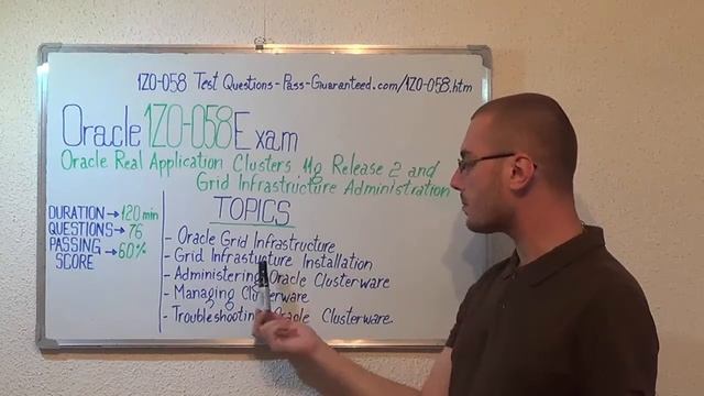 For more information on Oracle 1Z0-058 Practice Test Questions Please Visit: https://www.Pass-Guaranteed.com/1Z0-058.htm What am I going to be tested for? The 1Z0-058 Real Application Clusters tests if you can have the skills required to support products and describes RAC architecture and provides an overview of the product, including Real Application Clusters 1Z0-058 One Node. Which are some of the topics of the 1Z0-058 Administration exam? Test Topic 1: Oracle Grid Infrastructure Questions (Exam Coverage 14%) Test Topic 2: Administering Oracle Clusterware Test Questions (Exam Coverage 22%) Test Topic 3: Managing Clusterware Questions (Exam Coverage 24%) Test Topic 4: Troubleshooting 1Z0-058 Clusterware Questions (Exam Coverage 18%) Test Topic 5: Administering ASM Instances Questions (Exam Coverage 10%) Test Topic 6: RAC Database Exam Administration Questions (Exam Coverage 12%) Who can attend to Oracle Real Application Clusters 11g Release 2 and Grid Infrastructure Administration test? The 1Z0-058 Real Application Clusters 11g: Grid Infrastructure Administration (1Z0-058) exam is mainly intended for Data Warehouse Administrator, Database Administrators, Database Designers, those with a solid foundation in Real Application Clusters and Grid Infrastructure Administration. Can you give me some in-depth information on the 1Z0-058 exam topics? • Describe Cluster hardware best practices • Install Oracle Grid Infrastructure • Use OUI to remove a node from an test Clusterware home • Implement ASM Cluster Exam test File System • Locate 1Z0-058 Clusterware log files • Perform a single instance to RAC conversion • 1Z0-058 RAC-specific tuning components • Manage ASM volumes What’s the 1Z0-058 passing score and duration? The duration of this exam is 120 minutes (76 questions) and the minimum passing score is 60%