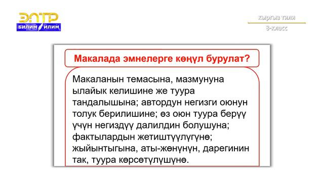 8-класс | Кыргыз тили | Публицистикалык стиль. Макала (дубал гезитке)