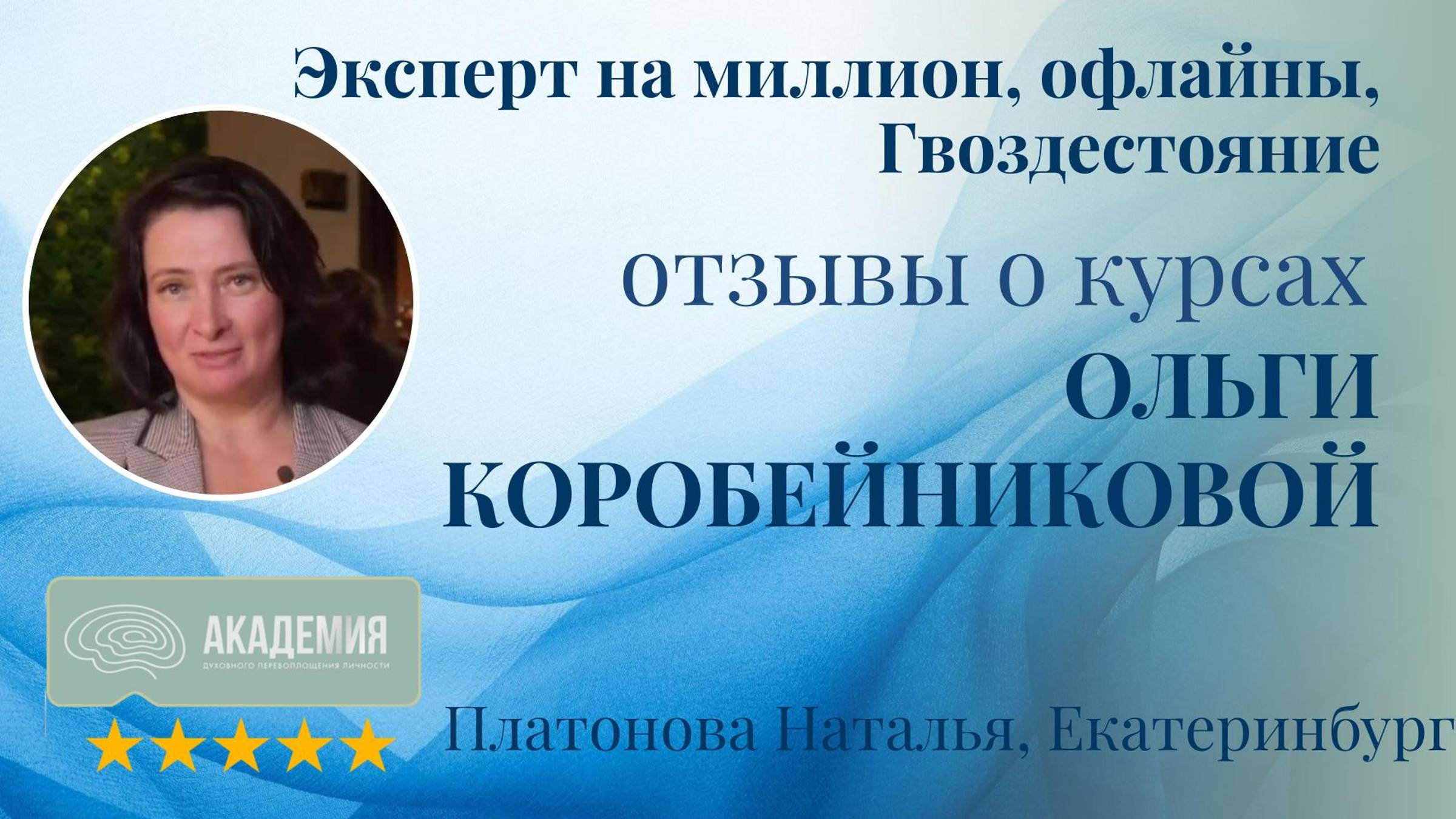 Отзывы о курсах Ольги Коробейниковой 17: "Эксперт на миллион," офлайн-сессии, "Гвоздестояние" 17. Платонова Наталья, Екатеринбург Точка А: Состояние до курса Желание профессионального и личностного роста. Путь к изменениям: Как курсы Ольги Коробейниковой помогли Участвовала в групповой практике гвоздестояния и внедряла рекомендации, полученные на курсах. Точка Б: Результаты после курсов Ольги Коробейниковой Обрела ощущение полета и уверенность в себе. Отзывы о курсах Ольги Коробейниковой подтверждают, что такие программы, как "Эксперт на миллион" и "Гвоздестояние," помогают участникам обрести внутреннюю силу, уверенность и расширить возможности для профессионального роста.