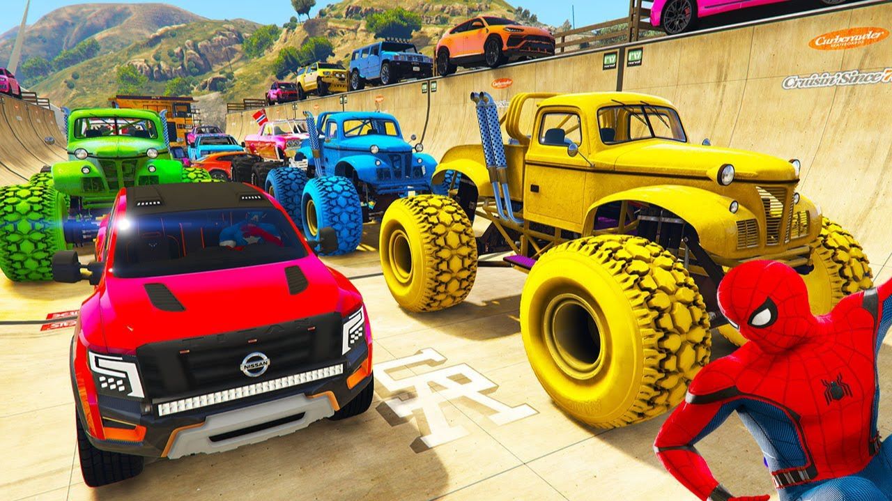 ЧЕЛОВЕК-ПАУК МАШИНКИ МЕГА-Трак Монстр-Трак Испытание на рампе! СУПЕРГЕРОИ на Супер Гонках с трюками