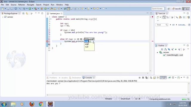 Java in Telugu - Tutorial 11 - else if Statement ----------------------------------------------------------------------- Useful Tutorials: C Tutorials : https://www.youtube.com/watch?v=JSZAfJmHsQw&list=PLC2mgeYbYNm-n8Iz-_3MuNsJFzr0UlGUu C++ Tutorials : https://www.youtube.com/watch?v=OLFfHQyfPZY&list=PLC2mgeYbYNm9keJjsA95jKa4EUVLd7mQP Java Tutorials : https://www.youtube.com/watch?v=WE0NIdCtt_M&list=PLC2mgeYbYNm_QXAszFlWex6KZt66iqfTV Python Tutorials : https://www.youtube.com/watch?v=LajgX-9nNB8&list=PLC2mgeYbYNm-3aTUq98pbmrA3P1_m-aJR Ms-Office : https://www.youtube.com/watch?v=fk3k2COEVuI&list=PLC2mgeYbYNm-ZWZFM-d19s4hsdNatVD68 Web Designing Course : https://www.youtube.com/watch?v=yWE4L1Oa1AU&list=PLC2mgeYbYNm-aFMphrZ13RPKs20Sh8Fj7 JavaScript Tutorials : https://www.youtube.com/watch?v=pDdgpwRA_lI&list=PLC2mgeYbYNm-jAsJm-tTr-yH1XEpQPa36 jQuery Tutorials : https://www.youtube.com/watch?v=tggCrJGmzCA&list=PLC2mgeYbYNm8_zBsvZipTH_A0bJgfnuSu Build Website using Bootstrap, Html, CSS, JS, and jQuery : https://www.youtube.com/watch?v=VkEfKO_sYNU&list=PLC2mgeYbYNm-5dnZo0Wce3U1acLxcjGny PHP Tutorials : https://www.youtube.com/watch?v=Z3Y8z09dmF4&list=PLC2mgeYbYNm8TRhX27z6JG0DtR8FR_WuO Blogger Tutorials: https://www.youtube.com/watch?v=4cPImms8S7o&list=PLC2mgeYbYNm8j6dLlY-fayDPvob2fPpn5 AngularJS Tutorials: https://www.youtube.com/watch?v=auHNkdCoh7U&list=PLC2mgeYbYNm9zfTasL131Ggc8JFrVtc9C Photoshop Tutorials: https://www.youtube.com/watch?v=v5lrwxJSqaA&list=PLC2mgeYbYNm8nggbtwRulTE2fpqGOD0zh Download Softwares: https://www.youtube.com/watch?v=zVgmRXmpyL4&list=PLC2mgeYbYNm-UtWiEpdcg13kmgWGukKEd Premiere Pro CS4 Tutorials: https://www.youtube.com/watch?v=NfRo0F9cyCA&list=PLC2mgeYbYNm8wja5N7WJoMO4rpCBUbPmp Adobe After Effects CS4 Tutorials: https://www.youtube.com/watch?v=T1jk_5BXzlw&list=PLC2mgeYbYNm_koeKUk86XkL0leEX1gWKP ----------------------------------------------------------------------------------------------------- If you feel this video is useful, Please share it with your friends on Facebook, twitter Google plus etc.. Please Subscribe... For more Computer videos in Telugu... Please visit : www.telugucomputerworld.blogspot.com