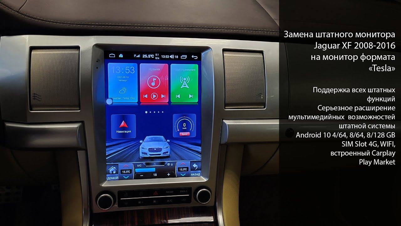 Демонстрация работы вертикального монитора в автомобиле Jaguar XF поколения 2008-2016, Подобная установка значительно расширяет мультимедийные возможности штатной системы.