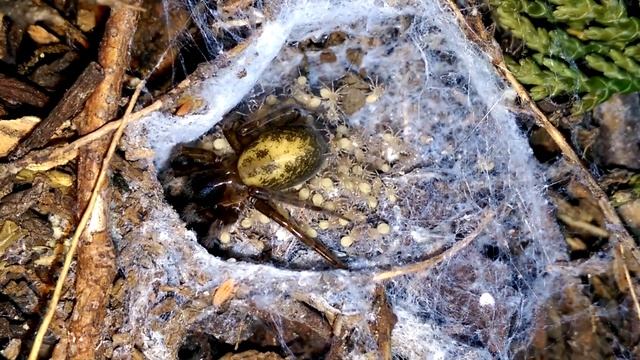 Checked the Amaurobius similis this morning at 5:30am and the first thing I noticed was the frenetic behaviour of the spiderlings. I knew that something was different and then, they started to bite and you can see the females reaction to this as she tries to kick them off. Then my phone rings and it's my lift for work and believe me I was so close to throwing a sicky but unfortunately spider watching doesn't pay the mortgage. So this is the video of the beginning of the young consuming their mother.