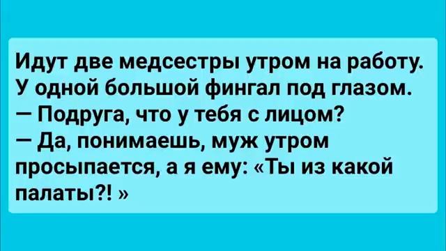 Сборник смешных анекдотов для настроения! Юмор! Смех! Позитив! 00:03 Блондинка в маршрутке • Блондинка в наушниках пытается пукнуть в маршрутке, думая, что никто не услышит из-за басов. • Пассажиры странно смотрят на неё, и она вспоминает, что в наушниках. • Мужчина просит уступить место беременной, но его жена не беременна. 00:36 Предложение на берегу моря • Парень предлагает девушке пожениться, она соглашается. • После этого наступает долгая пауза, парень молчит. • Девушка спрашивает, почему он молчит, и он отвечает, что, кажется, сказал лишнего. 00:55 Утренний разговор медсестёр • Две медсестры идут на работу, у одной большой фингал под глазом. • Подруга спрашивает, что случилось, и медсестра отвечает, что муж спросил её, из какой она палаты. 01:10 Отсутствие продуктов в магазине • В магазине нет гречки, макарон и хлеба. • Покупатель спрашивает, где хлеб, и ему отвечают, что это мебельный магазин. 01:28 Просьба сатаны к богу • Сатана просит бога забрать у него одного грешника, который перебил всех демонов и чертиков. • Грешник залез на трон сатаны и спрашивает, где переход на следующий уровень. 01:47 Гороскоп и супружеская измена • Жена читает мужу гороскоп и говорит, что там предсказана его супружеская измена с шикарной блондинкой. • Муж спрашивает, не указан ли адрес или телефон блондинки.