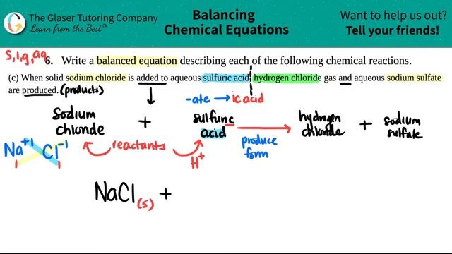 Write a balanced equation describing each of the following chemical reactions. When solid sodium chloride is added to aqueous sulfuric acid, hydrogen chloride gas and aqueous sodium sulfate are produced. OpenStax™ is a registered trademark, which was not involved in the production of, and does not endorse, this product. If you don't have the OpenStax™ "Chemistry: Atoms First" textbook, here is a link in which you can download it for FREE! https://d3bxy9euw4e147.cloudfront.net/oscms-prodcms/media/documents/ChemistryAtomsFirst2e-OP_T2wT7wj.pdf SUBSCRIBE if you'd like to see more solutions for your textbook! https://www.youtube.com/channel/UC2C34WdYMOm47PkWovvzLpw?sub_confirmation=1 Want us as your private tutor? Get started with your FREE initial assessment! https://glasertutoring.com/contact/ #BalancingEquations #BalancingChemistry #OpenStaxChemistry