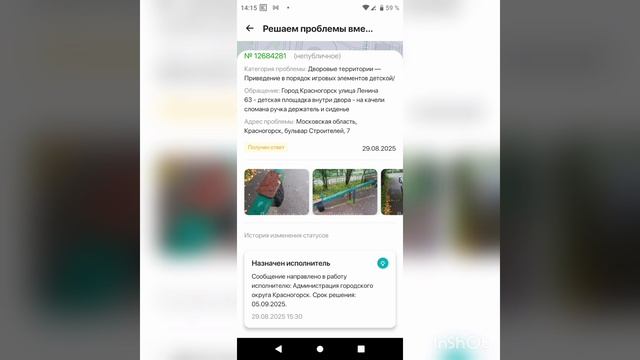 Всем добрый день. Немного ответов с сайта Добродел. Город Красногорск улица Ленина 63 - детская площадка рядом со входом в детский сад. Меня одну удивляет, что ни одна мамочка с ребенком не написала о том, что детские качели опасны и сломаны, при этом все ходят именно через нее к нашему дому... Всем безопасного города.