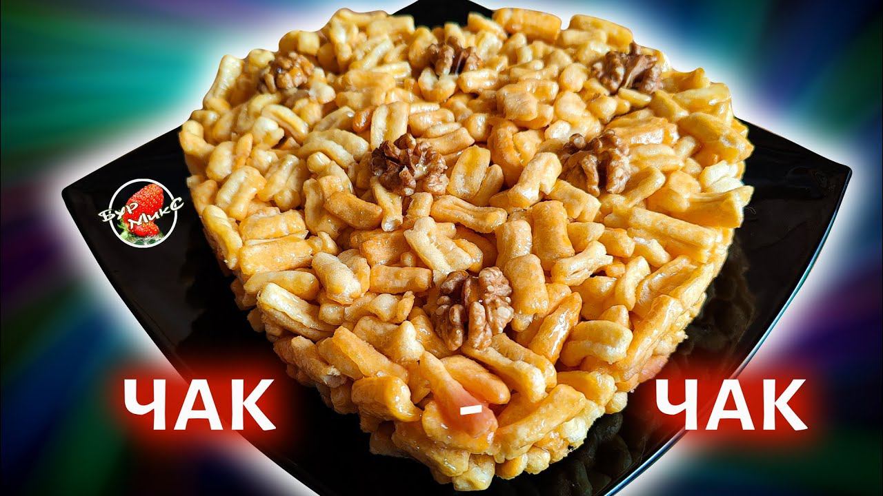 Чак-ча́к (тат. чәк-чәк) — мучное восточное печенье из обжаренных во фритюре кусочков теста, перемешанных с медовым сиропом. Национальное кулинарное изделие татар и башкир. Наряду с «эчпочмаком» чак-чак — одна из визитных карточек Республики Татарстан. Ингредиенты на форму диаметром 26 см: Пшеничная мука в/с – 250 г Куриные яйца – 3 шт Соль – 2,5 г Сахарный песок – 50 г Мёд – 175 г Масло растительное – 200 мл Как готовить Чак-чак. Готовим тесто. В глубокую чашу просеиваем муку высшего сорта. Добавляем щепотку соли. Перемешиваем. Делаем в центре углубление. Вбиваем три яйца и замешиваем тесто. Тесто получается довольно-таки плотным. Кладём его в чашу, накрываем и даём отдохнуть 30 минут. Через 30 минут делим тесто на две части и каждую часть раскатываем в тонкий пласт толщиной примерно 2-3 мм. Присыпаем лепёшку мукой, разрезаем на пласты шириной в 1 см и нарезаем тонкой соломкой. В глубокую сковороду наливаем 200 мл рафинированного растительного масла и хорошенько его прогреваем. Чтобы проверить нагрелось ли масло, опускаем в масло деревянную шпажку, если от неё идут пузырьки, значит масло прогрелось и его можно использовать. Берём большую горсть подготовленной лапши и отправляем её на сковороду. Обжариваем постоянно помешивая. Сразу много лапши в сковороду не выкладывайте: во-первых она увеличивается в размере и во-вторых, если вы наложите много, то масло быстро охладится и тесто начнёт его впитывать. Обжариваем лапшу буквально несколько секунд, как только тесто начинает румяниться, сразу извлекаем из масла при помощи шумовки и перекладываем в чашу (на до чаши я кладу бумажное полотенце, чтобы оно убрало лишнее масло). Готовим сироп. В вок или в сотейник выкладываем сахар и мёд. Когда мёд и сахар расплавятся, доводим температуру сиропа до 118°С и снимаем с плиты. Отправляем в сироп приготовленную лапшичку, быстро и тщательно перемешиваем. Перекладываем в форму, дно формы застелить пекарской бумагой. Разравнять чак-чак по форме, слегка придавливая, смоченными в холодной воде руками. Затем отправляем чак-чак на полчаса в холодильник, чтобы он полностью остыл. Через 30 минут достаём чак-чак, извлекаем его из формы, убираем пергамент и выкладываем на тарелку. Приятного чаепития!