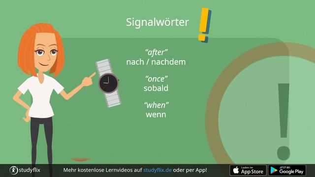 Das Past Perfect beschreibt Ereignisse der Vorvergangenheit. Wie du das Past Perfect bildest und richtig verwendest, zeigen wir dir hier. Mehr Videos auf https://studyflix.de/ ! Du bildest das Past Perfect mit der Vergangenheitsform von to have, also had, und dem Past Participle . Bei regelmäßigen Verben setzt sich das aus dem Infinitiv und der Endung -ed zusammen. Bei regelmäßigen Verben sieht das Past Perfect also so aus: When we came home, Nora had already started to make dinner. Doch unregelmäßige Verben haben im Past Participle ihre eigene Form: I had already eaten, but then they invited me over for dinner. 00:13 Past Perfect – Bildung 00:40 Past Perfect – Verwendung 01:57 Past Perfect – Signalwörter 02:43 Besonderheiten -------------------------------------------------------------------------------------------------------------------------- Hier findest du das Video auf unserer Seite: https://studyflix.de/englisch/past-perfect-2852 -------------------------------------------------------------------------------------------------------------------------- Weitere Informationen findest du auf Facebook: https://www.facebook.com/studyflix/ oder auf unserer Webseite: https://studyflix.de/ Hier geht´s zur kostenlosen Studyflix-App: - Play Store: https://play.google.com/store/apps/details?id=de.studyflix.studyflix&hl=de&gl=US - Apple Store: https://apps.apple.com/de/app/studyflix-deine-lernapp/id1514546785 --------------------------------------------------------------------------------------------------------------------------- Über uns: Studyflix ist eine junge, schnell wachsende E-Learning Plattform, die kostenlose Lernvideos für Dich zur Verfügung stellt. Wir produzieren Videos für Schüler, Studenten und Azubis, um so die Lehrinhalte einfach und verständlich zu erklären. Täglich kommt ein neues Video dazu. Von Wirtschaft, Mathematik, Physik, Chemie über Technik bis zu allgemeinen Themen – alles ist dabei. Wir sind überzeugt, dass Lernen nicht langweilig oder gar teuer sein muss! Deshalb bieten wir hochwertige, animierte Lernvideos, mit denen Lernen Spaß macht – und das komplett kostenlos.