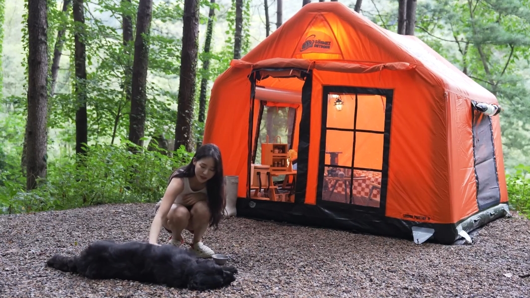 Кемпинг под дождем в новой надувной палатке.
