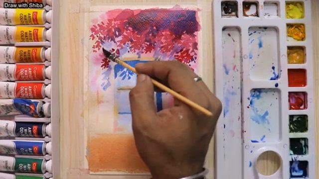 Красивый цветок, дерево и дверь акварелью. Простой пошаговый урок для начинающих