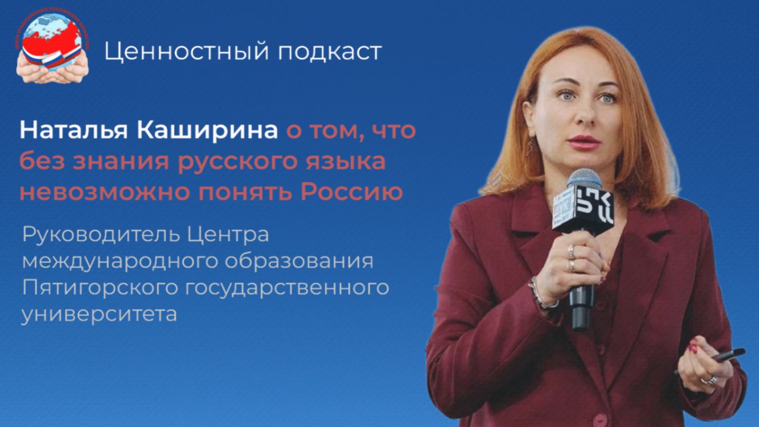 «Без знания русского языка невозможно понять Россию» Через что, в первую очередь, происходит осознание своей принадлежности к России? Как иностранцы воспринимают русский язык за границей? Как наш язык помогает нам оставаться сильным государством? Ответы на эти вопросы ищите в пятой серии «Ценностного подкаста». 👤Гость выпуска: Наталья Михайловна Каширина - руководитель Центра международного образования Пятигорского государственного университета. 👤Ведущий: Григорий Сергеевич Мхитарьян - кандидат филологических наук, руководитель программ АНО «Центр знаний «Машук», лектор Российского общества «Знание». Телеграм-канал: t.me/oblakamorali