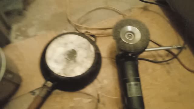 На чугунной сковородке накопился нагар. Ни чем не хотел смываться. Разные моющие средства не помогали. Часть поддалась ножу. Решил попробовать болгаркой, результат 15 минут работы на видео