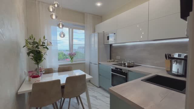 Видеообзор небольшой бело-голубой кухни на Осипенко,9