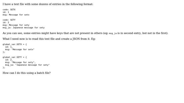 Batch file to read a file and create a JSON? Helpful? Please support me on Patreon: https://www.patreon.com/roelvandepaar With thanks & praise to God, and with thanks to the many people who have made this project possible! | Content (except music & images) licensed under CC BY-SA https://meta.stackexchange.com/help/licensing | Music: https://www.bensound.com/licensing | Images: https://stocksnap.io/license & others | With thanks to user thameera (superuser.com/users/84959), user Berend (superuser.com/users/361452), and the Stack Exchange Network (superuser.com/questions/803546). Trademarks are property of their respective owners. Disclaimer: All information is provided "AS IS" without warranty of any kind. You are responsible for your own actions. Please contact me if anything is amiss at Roel D.OT VandePaar A.T gmail.com