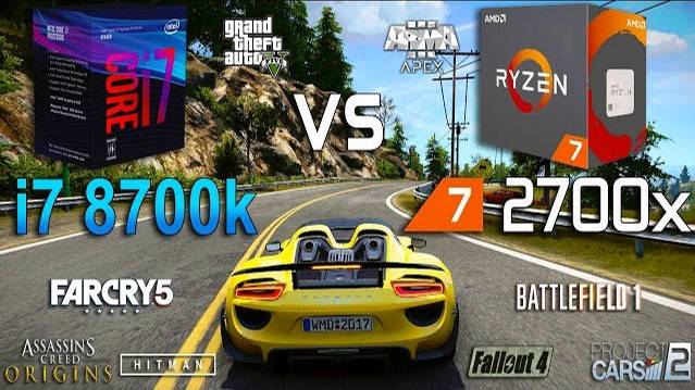 AMD Ryzen 7 2700x vs Intel Core i7 8700k in 8 Games (GTX 1080) Games: Project Cars 2 Grand Theft Auto V - 01:04 Arma 3 Apex - 02:00 Fallout 4 - 03:26 Assassin's Creed Origins - 05:00 Far Cry 5 - 06:35 Hitman - 07:21 Battlefield 1 - 08:53 System: Windows 10 Intel i7 8700k 3.7Ghz (turbo boost ~4.4Ghz) Asus ROG STRIX Z370-H AMD Ryzen 7 2700x 3.7Ghz (OC 4.2Ghz) Gigabyte X470 AORUS ULTRA GAMING GTX 1080 8Gb 16Gb RAM 3200Mhz