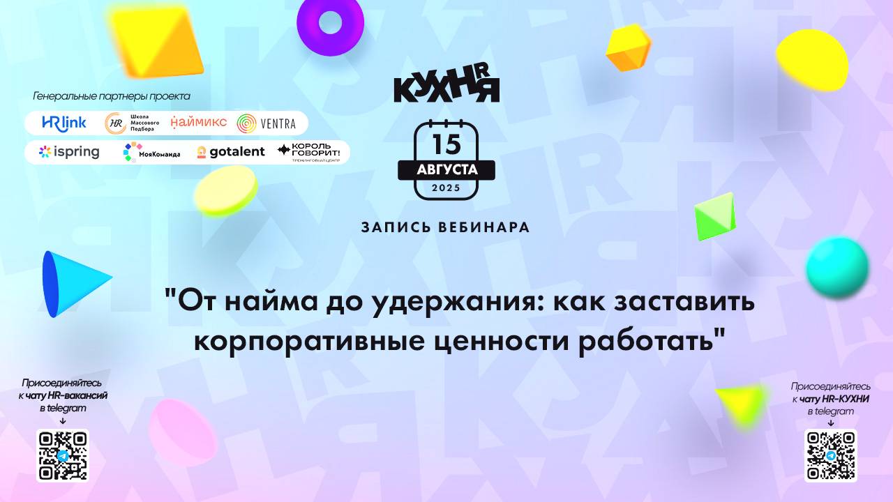 Присоединяйтесь к чатам и каналам HR-КУХНИ в телеграм: - Основной чат HR-КУХНИ в телеграм - https://t.me/+tYgAH0PgPQVkOWIy - Канал HR вакансий в телеграм - https://t.me/+CMNAN2u1hjo3M2Ri - Канал HR-EVENTS в телеграм - https://t.me/hr_kitchen - Канал HR JOURNAL в телеграм - https://t.me/hrkitchenjournal Полезные ссылки: - Каталог HR решений - https://hrkitchen.ru/exhibition - График конференций, бесплатных вебинаров, а также бесплатные курсы – https://hrkitchen.ru/ - Стать спикером HR-КУХНИ - https://hrkitchen.ru/speakers - Подписаться на полезную e-mail рассылку от HR-КУХНИ (новости, гайды, чек-листы, подарки от партнеров) - https://hrkitchen.ru/subscribe