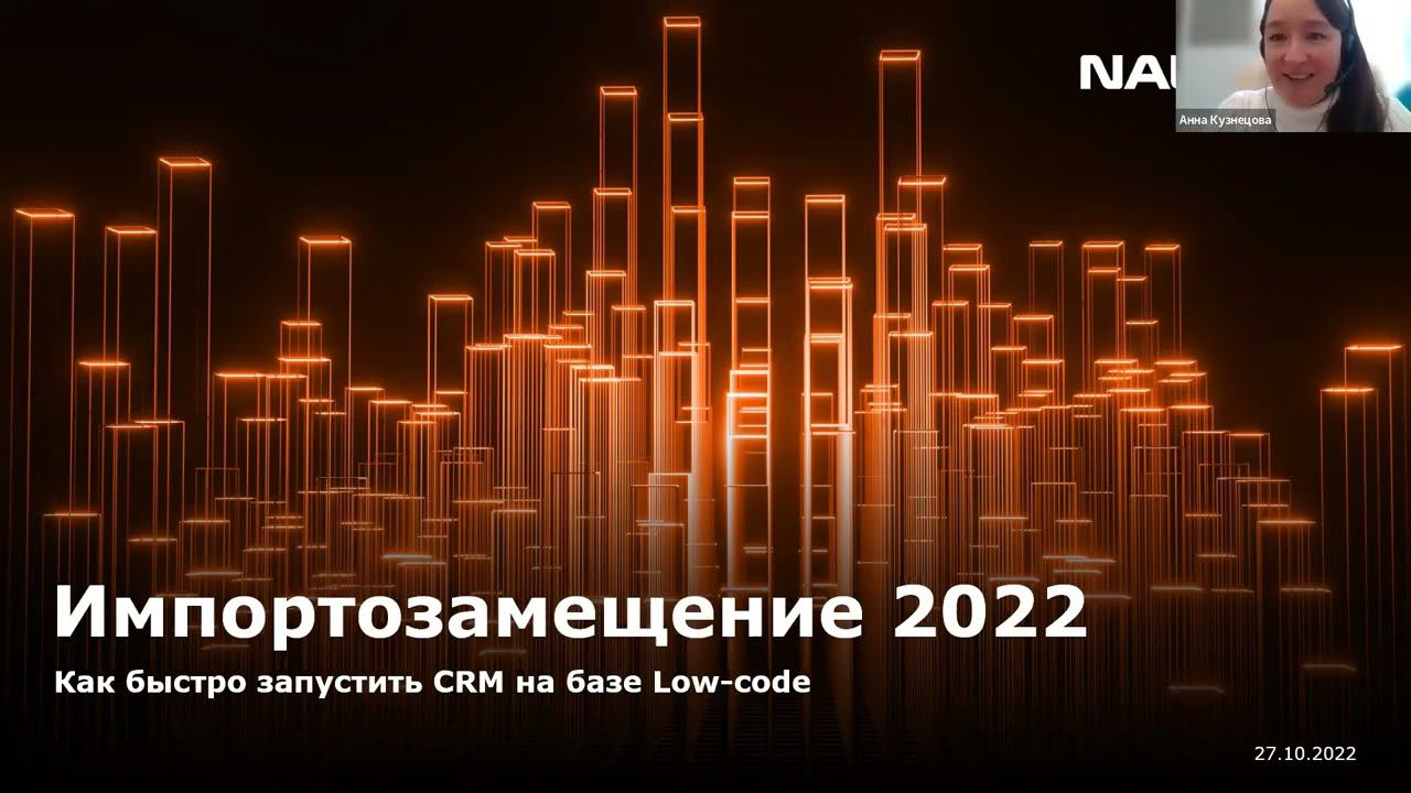 00:00 – формат вебинара 00:03:41 – современные тренды цифровой трансформации 00:00:29 – основные проблемы импортозамещения 00:08:27 – доля компаний, у которых используется CRM 00:10:03 – основные потребности бизнеса в части импортозамещения в 2022 году 00:11:02 – преимущества Low-code платформ для бизнеса 00:12:25 – возможности Naumen Service Management Platform 00:14:10 – возможности Naumen Customer Engagement Centre в части CRM 00:15:02 – проектный опыт Naumen 00:19:25 – как быстро запустить CRM на базе Low-code 00:34:46 – итоги вебинара